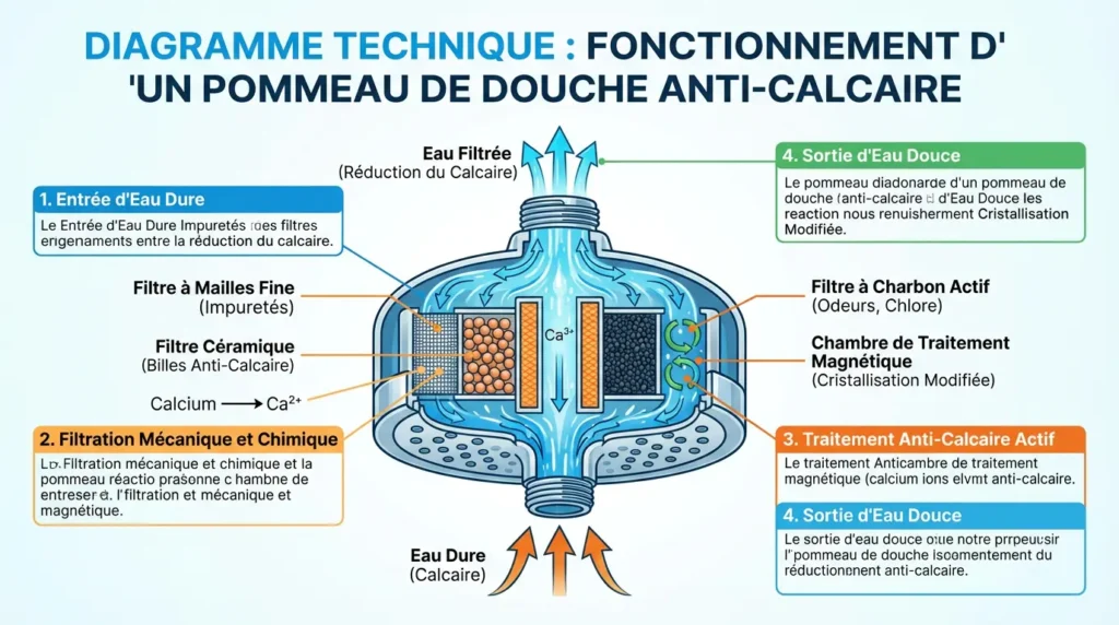 Un pommeau anti-calcaire agit sur ce processus par deux grandes approches. La première consiste à traiter l’eau en amont des buses, soit par filtration physico-chimique (résine échangeuse d’ions, KDF), soit par modification de la structure cristalline du calcaire (billes minérales, aimants). La seconde approche consiste à faciliter le nettoyage des buses grâce à des matériaux dont la surface lisse empêche le calcaire d’adhérer durablement, c’est le principe des buses en silicone.