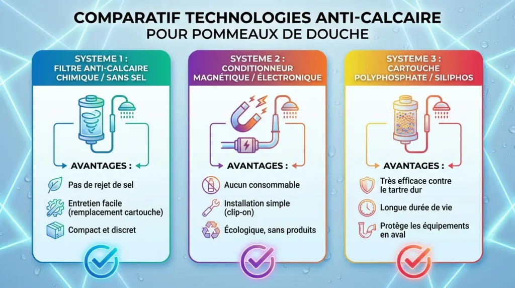 Quelles sont les différentes technologies anti-calcaire dans un pommeau de douche ?